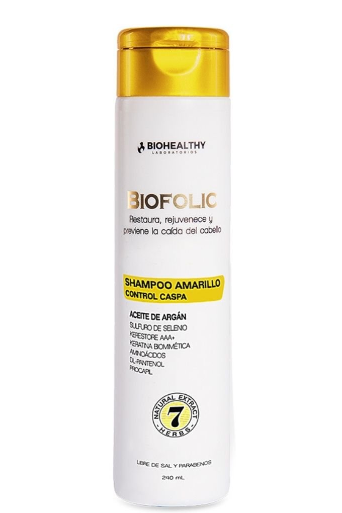 Biofolic shampoo amarillo es un tratamiento eficaz para cabello graso y dermatitis en cuero cabelludo que controla la Dermatitis Seborréica y genera brillo natural en el cuero cabelludo. Elimina escamación, caspa, pruritos y caída del cabello, gracias a la mezcla de patentes y plantas naturales. Tratamiento sobre la Tiña Versicolor o Ptiriasis Versicolor.