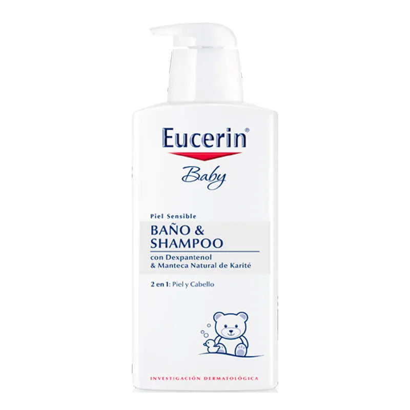 Eucerin Baby Baño & Shampoo es una fórmula 2-en-1 que no irrita los ojos, especialmente desarrollada por expertos en la piel para la limpieza de la piel y el cabello delicados del bebé, desde la cabeza hasta los pies del bebé. Es un limpiador ligero y suave, cuyos ingredientes (dexpantenol y manteca de karité) son simples, efectivos y comprobados.