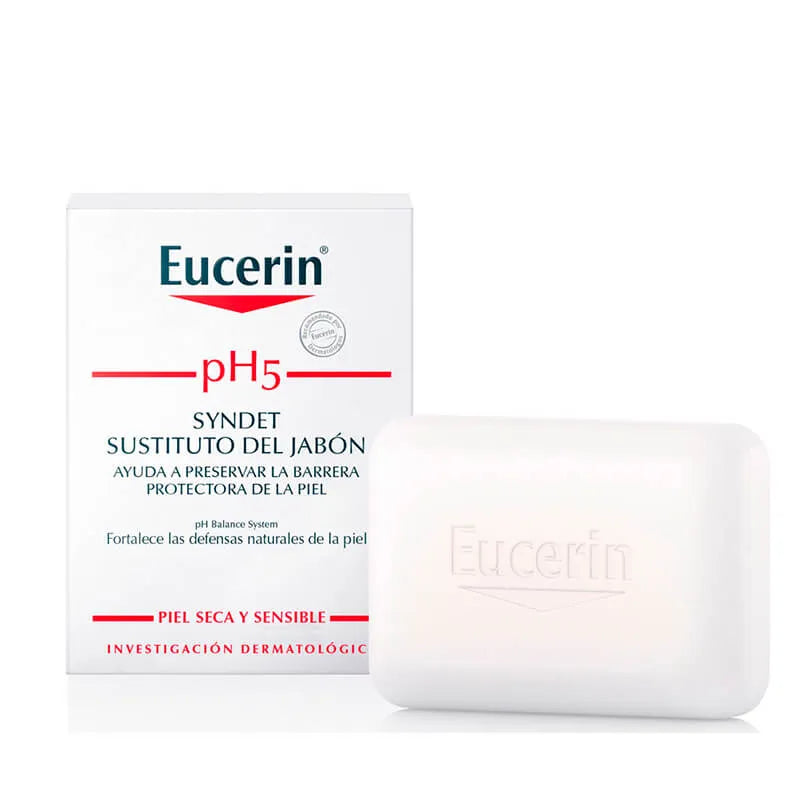 Eucerin pH5 Syndet Barra es un producto de limpieza suave en barra, diseñado para la piel sensible. Su pH es neutro para la piel, mientras que su combinación de Tampón de Citrato pH5 y los tensoactivos extra suaves ayuda a proteger la actividad enzimática, manteniendo la función de barrera de la piel y protegiéndola de la resequedad. Adecuada para el uso diario en la cara y en las manos.