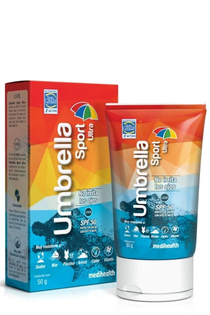 Umbrella Sport Ultra SPF 50 es un protector solar de alto desempeño diseñado especialmente para el deportista que busca un cuidado completo de su piel. Umbrella Sport Ultra SPF 50 es un protector solar de amplio espectro ya que protege la piel de la radiación solar UV-B y UV-A. Umbrella Sport Ultra SPF 50 fue evaluado clínicamente según estrictas normativas que demuestran su cumplimiento frente a estándares internacionales; su formulación soporta jornadas de actividad física y deportiva dentro y/o fuera del agua. Sus niveles de protección mostraron un adecuado desempeño durante la inmersión al agua, brindando una Muy alta protección solar y muy alta resistencia al agua (3 veces más resistente al agua, al sudor, al agua de la piscina y al agua de mar. Resistencia comprobada durante 120 Minutos de inmersión).